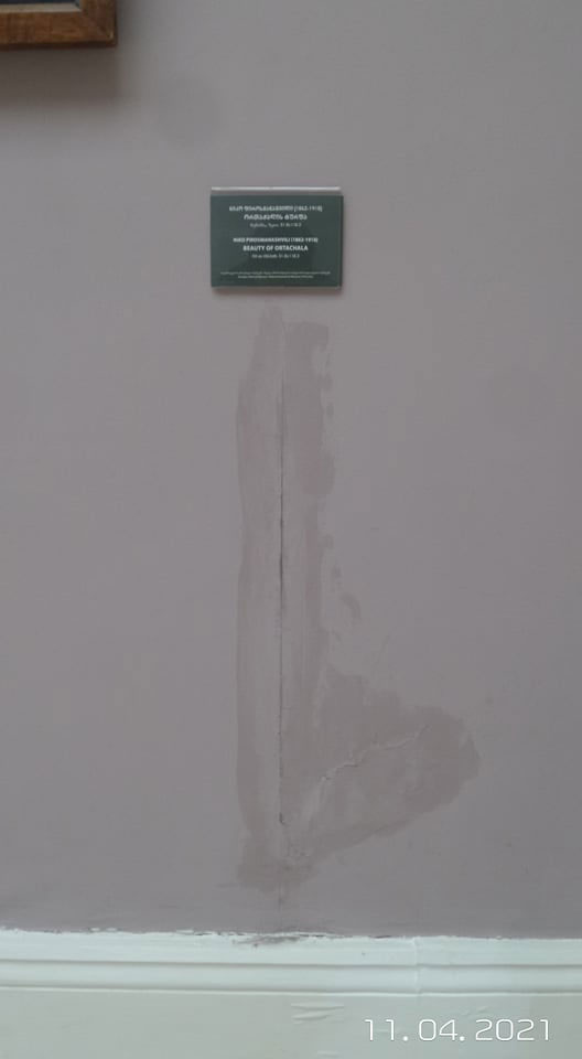 ეროვნულ გალერეაში, რომ პრობლემა იყო, ამის შესახებ პირველად 23 მარტს დავწერე. ვინაიდან შაბათ ღამეს დაწყებული წვიმა კვირას შუადღემდე გაგრძელდა, გალერეაში მივედი, რათა იქ არსებული მდგომარეობა ჩემი თვალით მენახა და დასველებული კედლის ფოტოები აქ იმავე დღეს, 11 აპრილს გამოვაქვეყნე.
