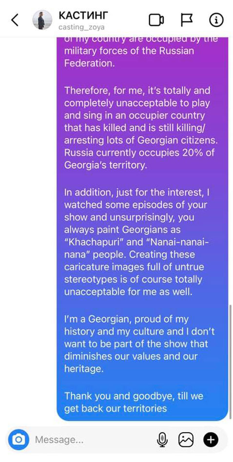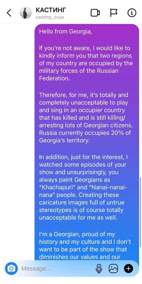 “ამ საშინელი რუსული შოუდან უკვე მესამედ მწერენ. შარშან და შარშანწინ უბრალოდ დავსინე. წელს კიდევ მომწერეს და უკვე ამოვიდა ყელში.