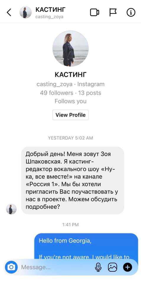 “გამარჯობა! მე ზოია შპაკოვსკაია ვარ, ტელეკომპანია “Россия 1”-ის მუსიკალური შოუს “Ну-ка, все вместе!” ქასთინგ რედაქტორი . გვინდა, ჩვენს შოუში მონაწილეობა შემოგთავაზოთ. იქნებ, დეტალურად განგვეხილა?